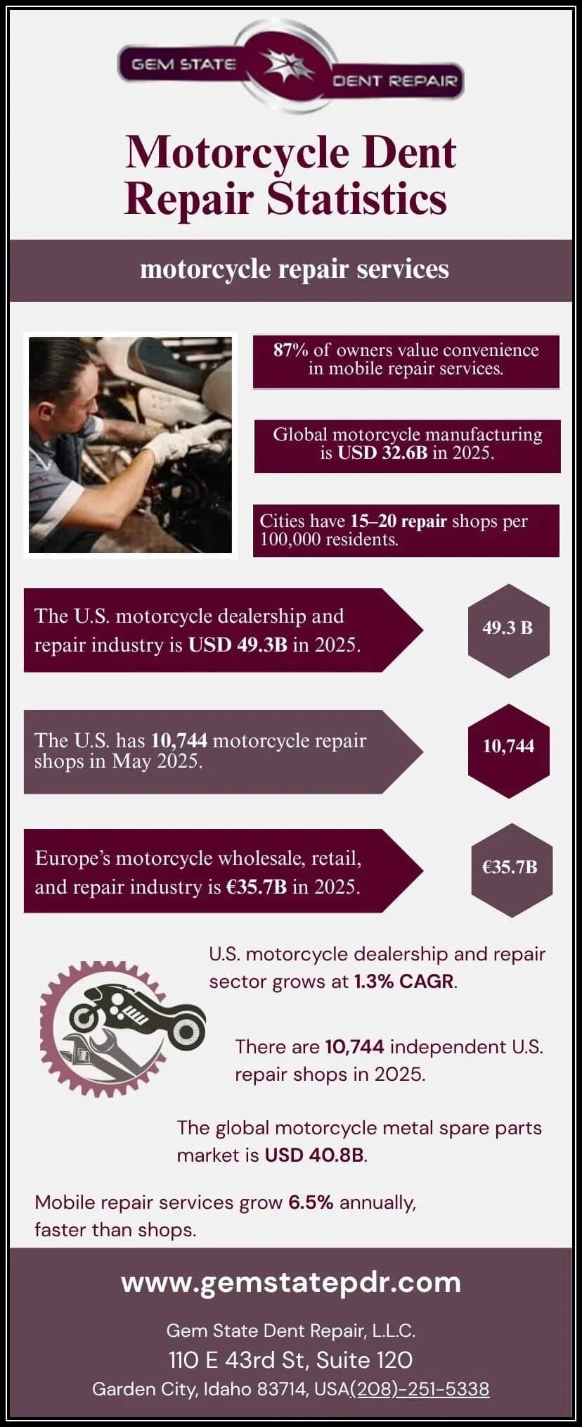 Motorcycle dent repair is a growing industry, with the U.S. market valued at USD 49.3B in 2025. Mobile repair services are highly valued, and repair shops and spare parts markets continue expanding globally.